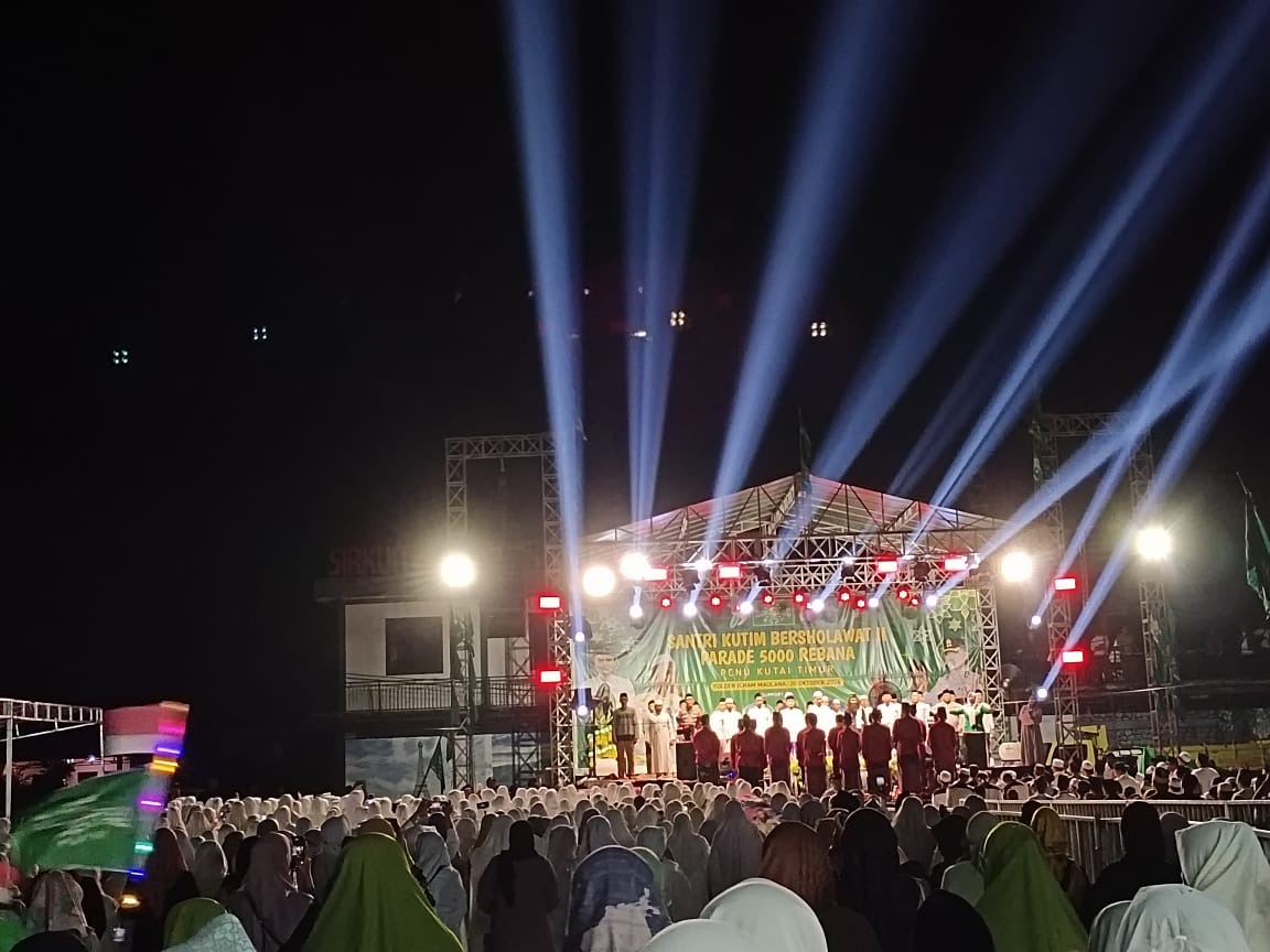 Bebaya.id, Sangatta – Gemuruh suara rebana berkumandang di Folder Ilham Maulana, Sangatta Utara, Sabtu malam (26/10/2024), saat berlangsungnya acara “Santri Kutim Bersalawat II”. Sebanyak 5.000 rebana dimainkan serentak dalam sebuah parade besar yang menjadi puncak peringatan Hari Santri di Kutai Timur (Kutim), menciptakan suasana religius dan persatuan yang kuat di kalangan masyarakat.